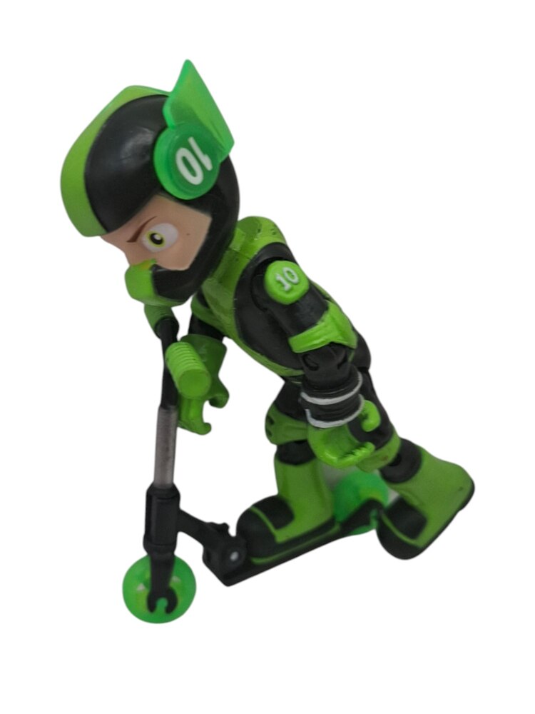 Accesorios del Vehículo: La figura viene montada o acompañada por una patineta o scooter de estilo moderno y elegante, de color negro y verde. El scooter tiene ruedas funcionales y está diseñado para que la figura pueda ser colocada en una pose de inclinación o velocidad.