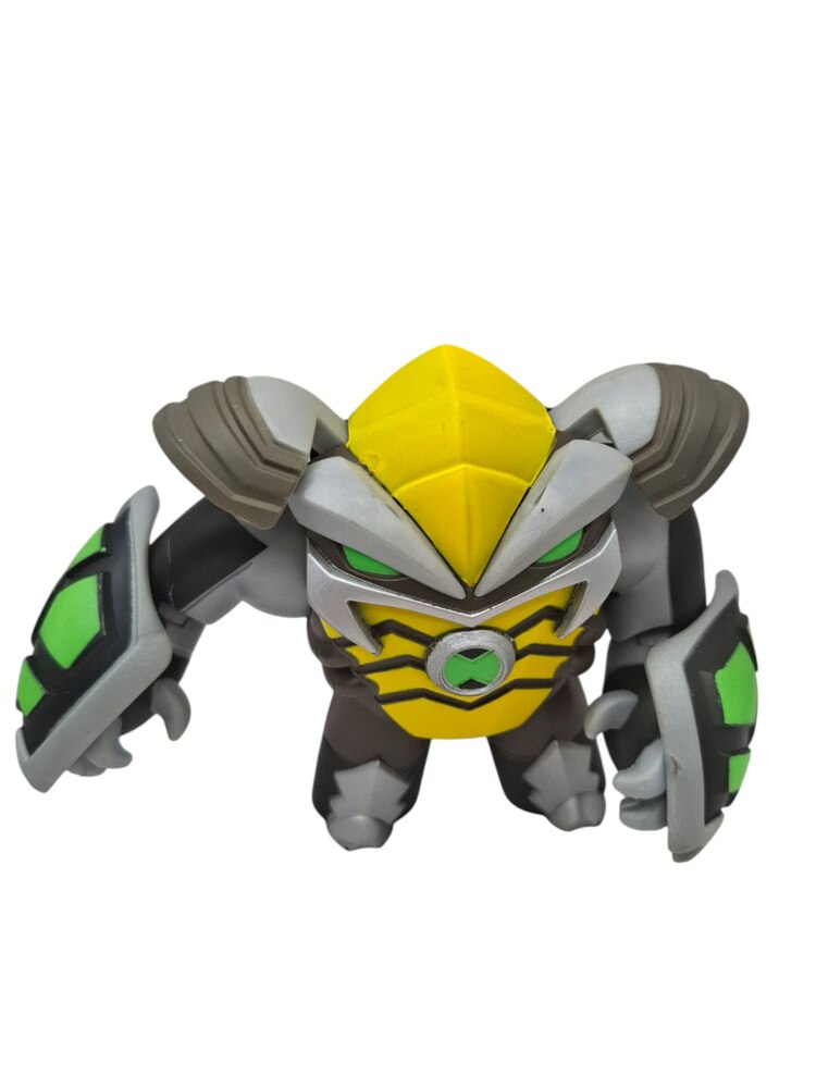 Símbolo del Omnitrix: El símbolo del Omnitrix está ubicado prominentemente en el pecho de la figura, en el centro de la coraza, un detalle crucial que identifica su origen como una transformación de Ben Tennyson.