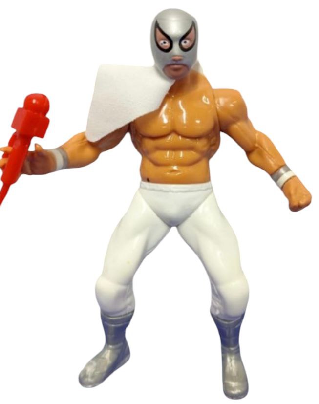 • Accesorios Distintivos: La figura incluye un elemento rojo (que podría ser un micrófono, un cetro o un arma estilizada) y un pañuelo o capa blanca sobre el hombro. Estos accesorios añaden teatralidad y un toque de gimmick a la figura, característica de las figuras de producción mexicana.