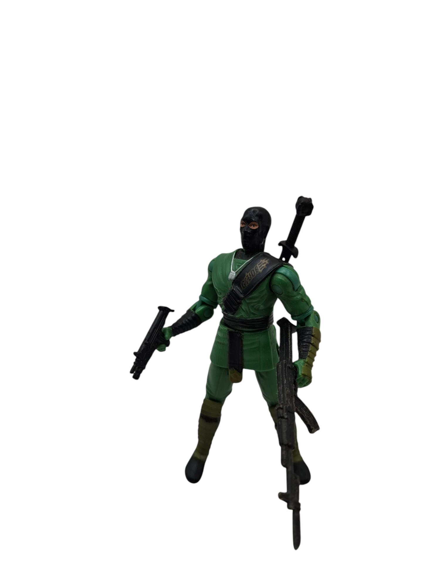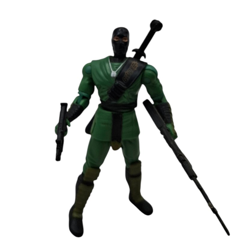 La Figura Cobra Ninja Verde Hasbro 2001 destaca por su esculpido y sus múltiples accesorios que refuerzan su rol de experto en combate: