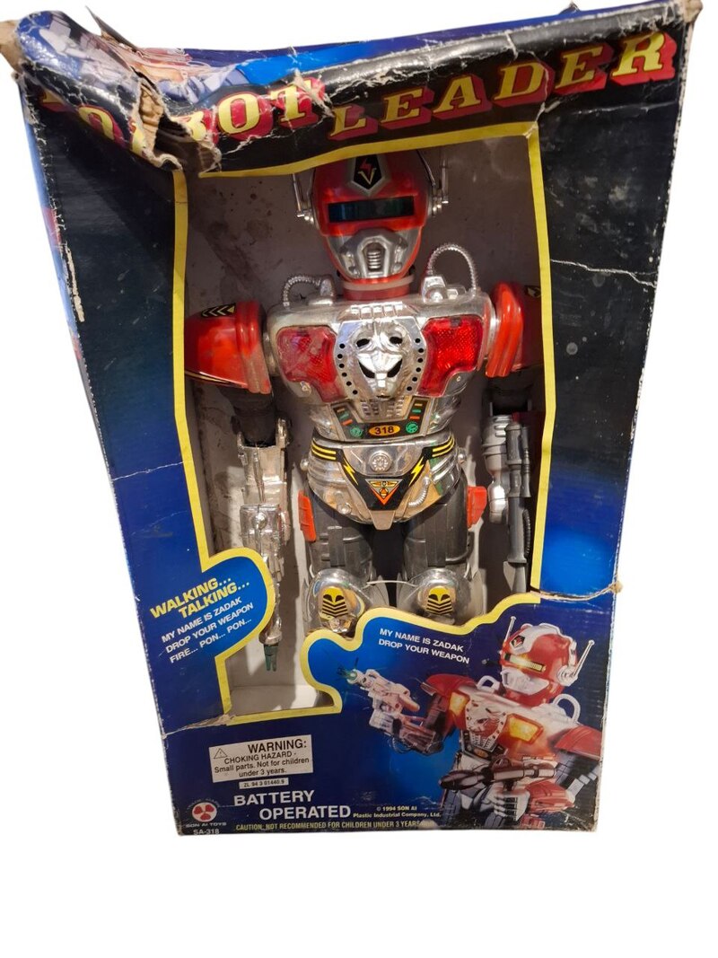 Prepárate para activar la nostalgia y viajar directamente a la era dorada de los juguetes electrónicos con este increíble Robot Leader Figura Vintage de los 90s, ¡completamente Nuevo en Caja (NIB)! Conocido por su carismático nombre “ZADAK”, este robot es una pieza de culto para cualquier coleccionista de juguetes retro y un portal a la simplicidad y el asombro de la tecnología de juguete de aquella década. Esta es una oportunidad única de poseer una pieza de historia del juguete en condiciones absolutamente prístinas.